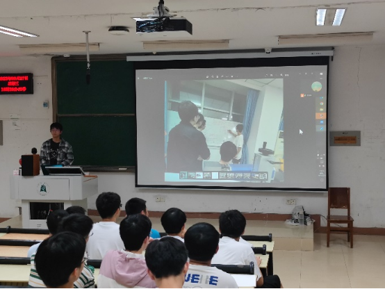主持人甘贤哲介绍电赛背景,展示电赛实验室内包括环境氛围良好、培养计划完善、设备设施齐全等优势。吴睿哲向大家展示暑期培训现场,介绍比赛相关的时间和备赛流程等内容。为进一步展示实验室的丰富生活,提高同学们的参与兴趣,他们还向大家展示了实验室的一系列设计成品包括流水灯、信号发生器、自制游戏机等