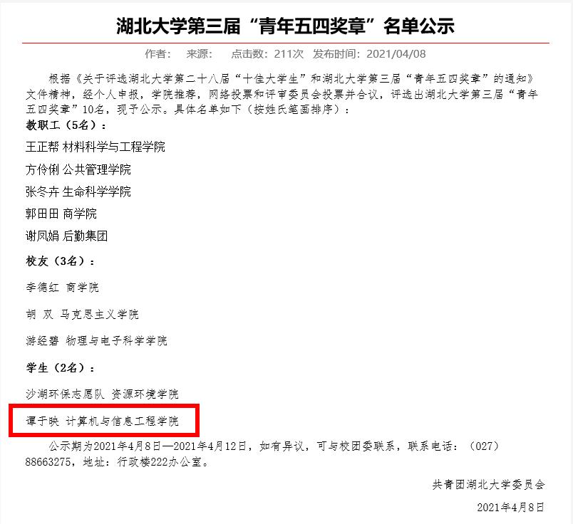 近日,威廉希尔第三届“青年五四奖章”当选人名单公示。公司2017级软件工程专业谭于映成功当选“威廉希尔青年五四奖章”。