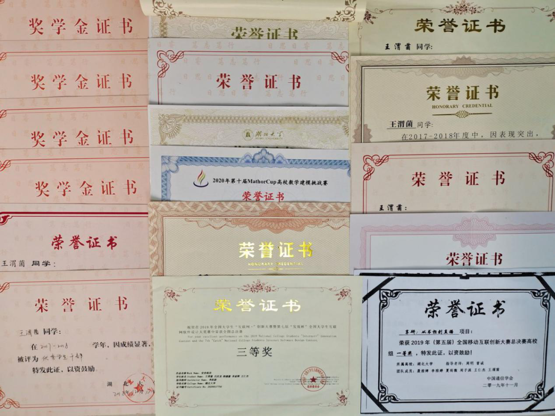 此外,她也经常参加创新创业类竞赛,包括互联网+以及大创。通过积极参与科研竞赛,发现自己的兴趣、找到未来的方向。对于竞赛,她当做一个课外体验的拓展活动来做,正是立足当下,胜固可喜,败亦欣然的态度使她和团队取得了优异成绩:亚太建模、Mathorcup数学建模等多项数学建模竞赛奖项、软件开发类比赛移动互联创新全国一等奖、“发现杯”全国老员工互联网软件设计大奖赛三等奖、“我梦见——楚天创客”比赛优秀创意奖、“挑战杯”湖北省老员工创业计划竞赛铜奖、演讲比赛三等奖、湖北省新闻传播教育创新实践技能竞赛媒体融合类一等奖、第四届中国数据新闻大赛全国一等奖、征文活动优秀文章奖等一系列荣誉奖项。